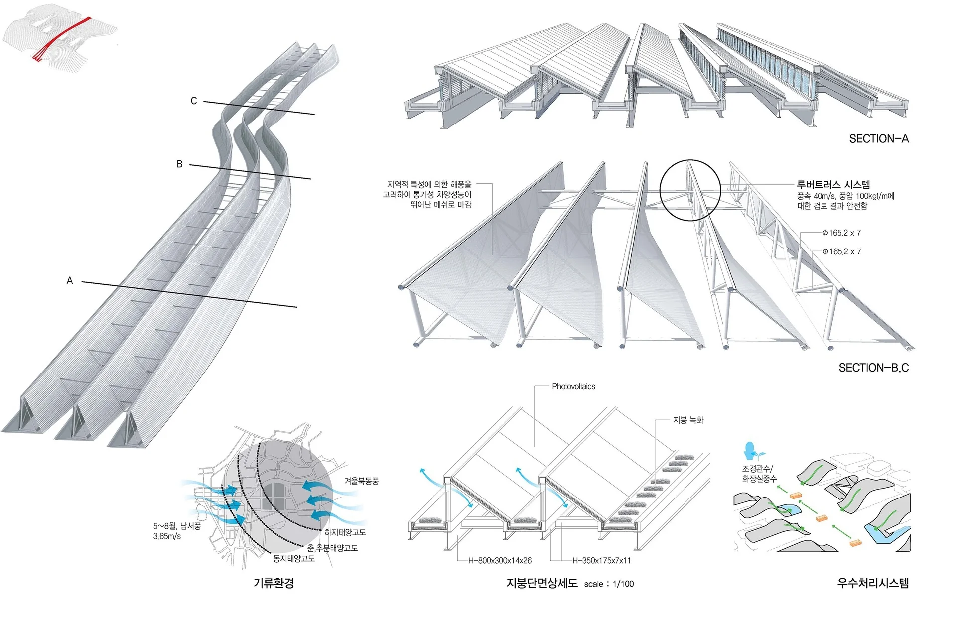 Tasked with the programmatic organization of over 50 pavilions for the Yeosu World Expo, we at Haeahn Architecture opted to form an interactive and adaptable fabric extend focus on oceanic subject matter. Functioning as a canopy, it ebbed as an environmental shade, and flowed into interactive public spaces. Additionally we designed an aesthetically compatible facade for the site's convention center.